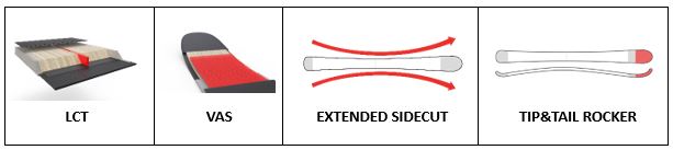 - z lyží na upravené trate pochádza technológia LCT, ktorá eliminuje kmitanie koncov lyže a zaisťuje ideálnu stopu lyží počas karvingových oblúkov.